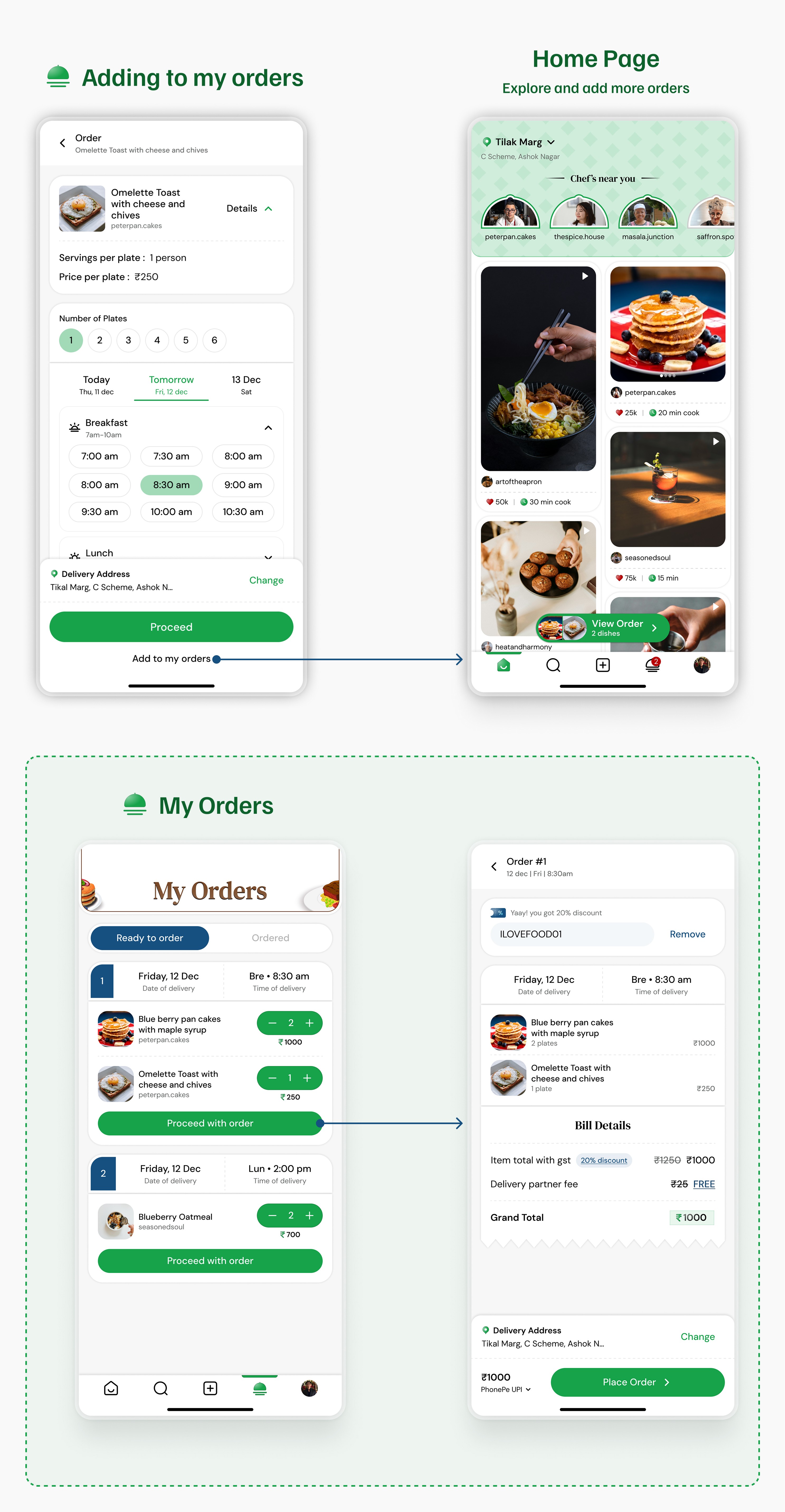 I focused on understand different behavioral patterns and user experience of existing social media and food delivery apps, learn and use them to design a platform that feels trustworthy and easy for homechef's to use on a daily basis and interesting for foodies to come and explore the best cuisines and recipes and eventually ordering them.