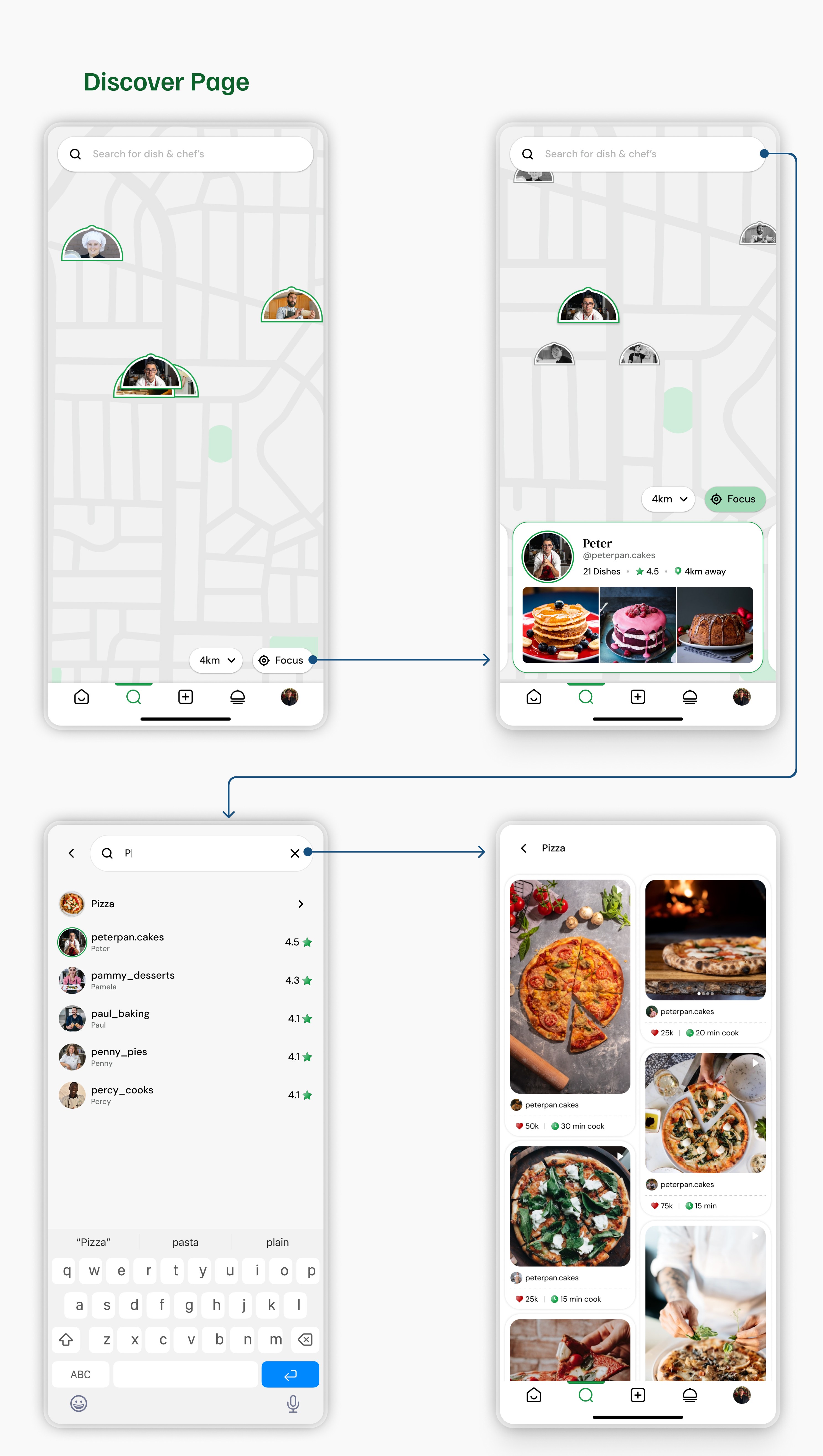 You can explore variety of dishes from different chef's in a pinterest like layout. Find the recipe of that dish and order it if the chef is within a set discoverable distance from you and is taking orders for that dish.